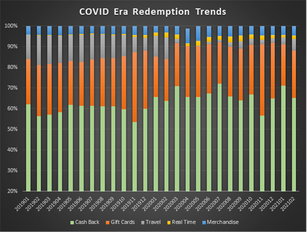 Unprecedented events came with unexpected changes. Since last year, COVID-19 has reshaped our habits on how we live, work, and shop. Undoubtedly, we see it continue to have an influence over consumer spending habits. With hospitality and travel being the most impacted industry, we have seen a significant shift in consumer earning and redeeming activity in the travel category.